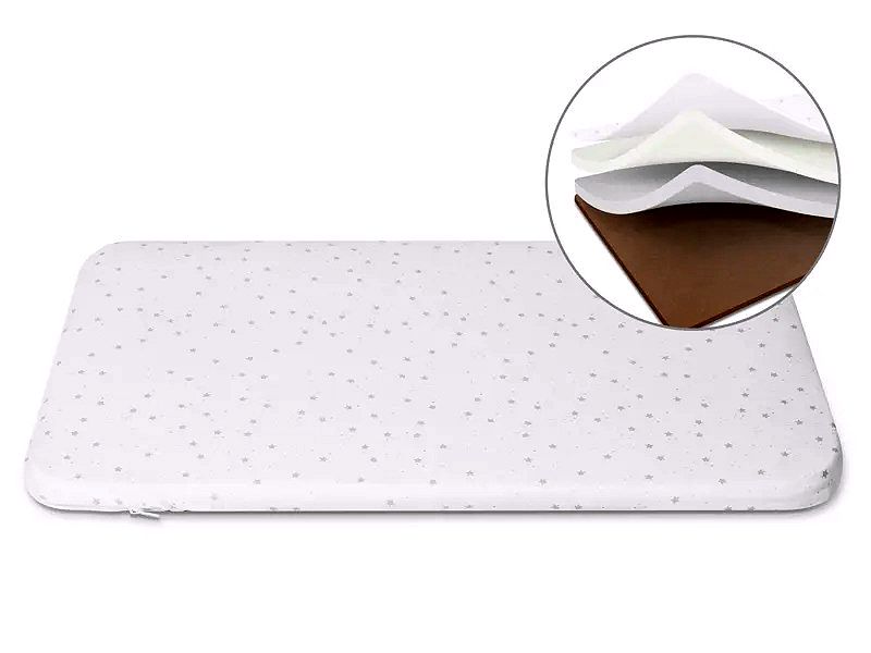 Die Matratze besteht aus Memory-Schaum und hochdichtem Schaumstoff und bietet eine weiche, zugleich feste Schlafunterlage für Neugeborene.