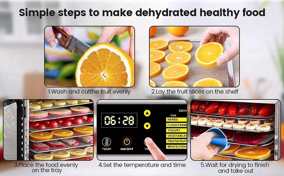 Dieser Dörrautomat besteht aus 100 % BPA-freiem, lebensmittelechtem Edelstahl. Er ist zuverlässig, korrosionsbeständig und verfügt über eine gute Feuerbeständigkeit, die zur Brandisolierung beiträgt und das Unfallrisiko deutlich reduziert.