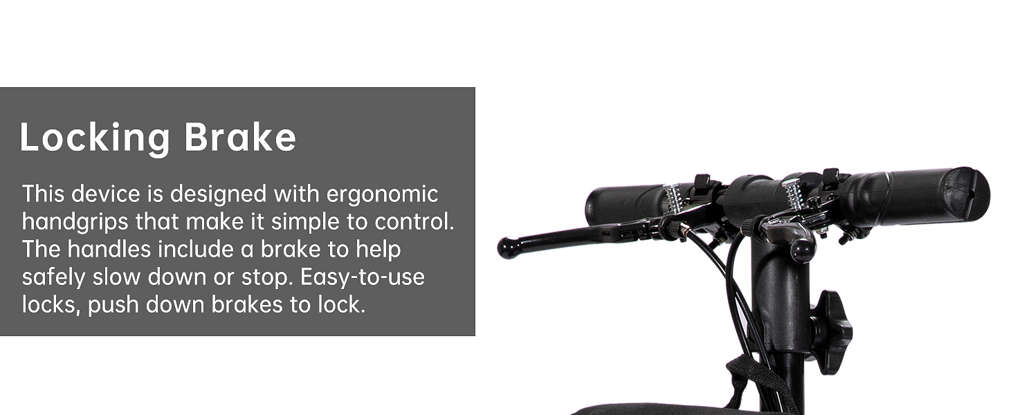 Der Knie-Scooter bietet exzellente Manövrierfähigkeit, unterstützt durch eine verstellbare Feststell-Handbremse sowie eine Hinterradbremse für zusätzliche Sicherheit.