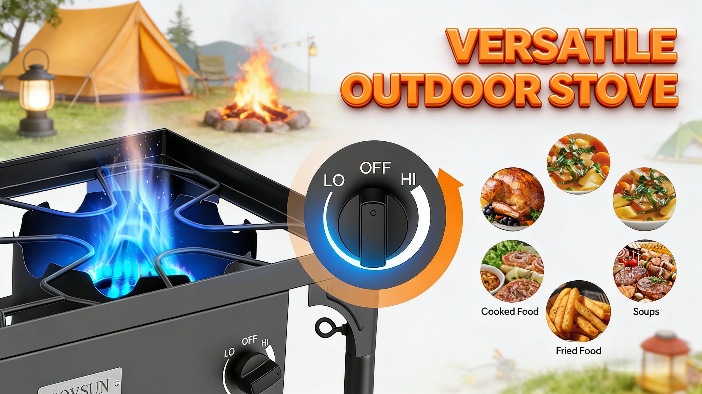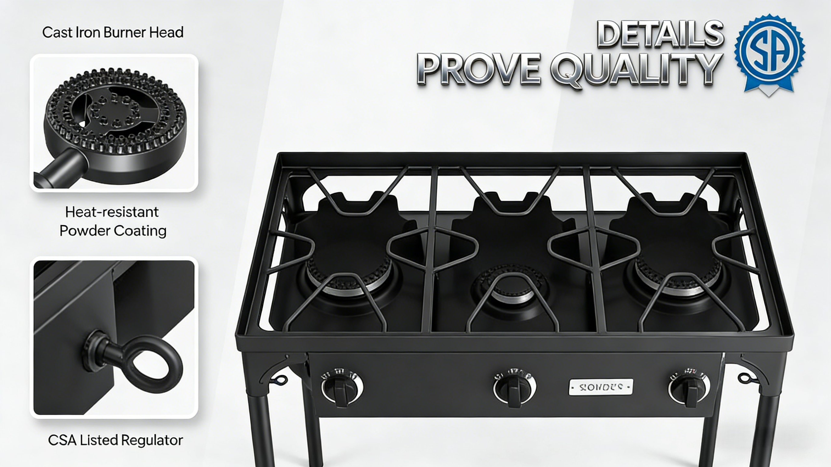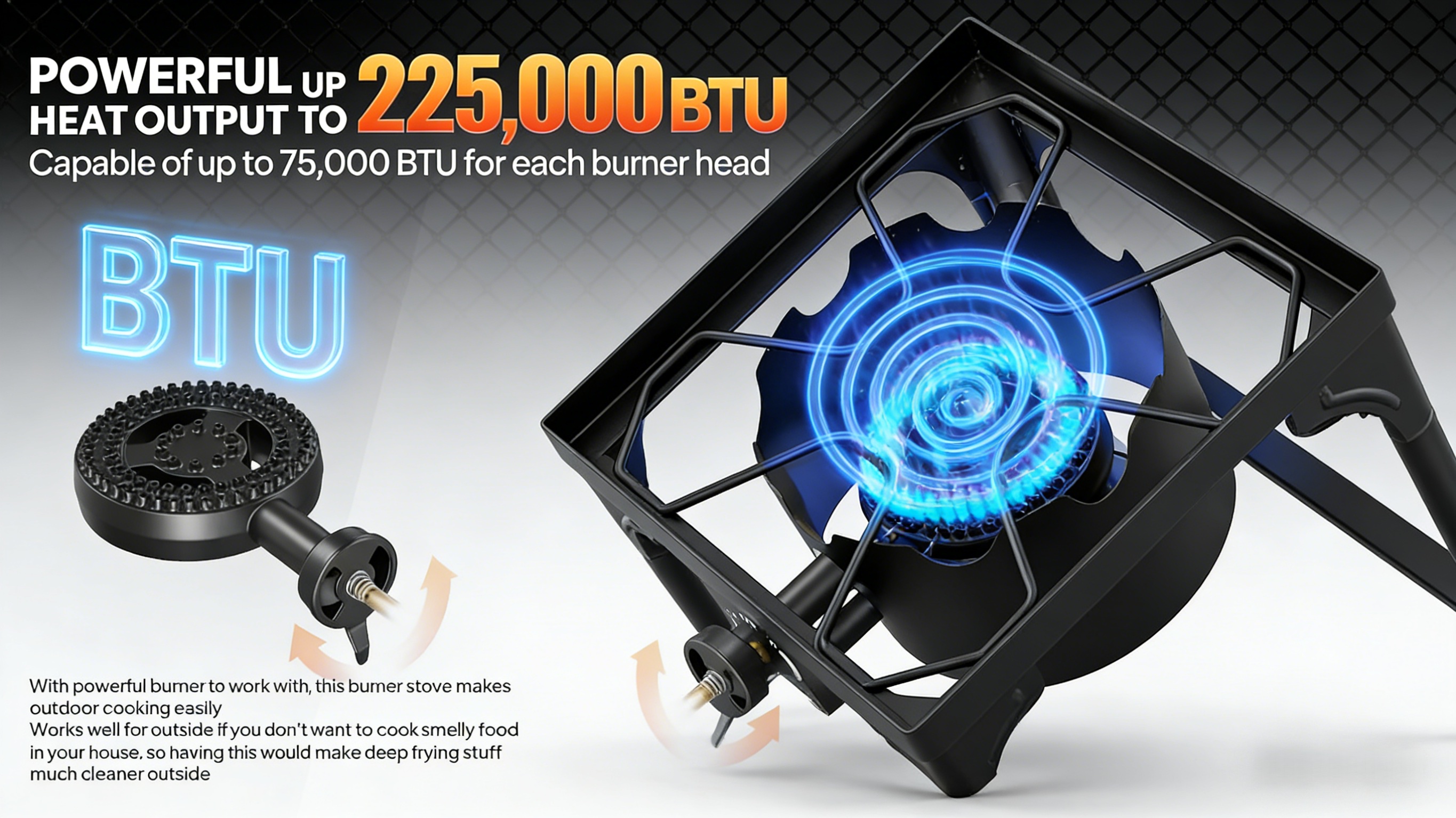 1. Powerful 225,000 BTU: Stove give off a strong flame that can be adjusted easily. Heat is controlled by a CSA approved regulator, which is more safety and longer working time. Three burner make it possible to cook more food at the same time, 75,000 BTU for each burner.