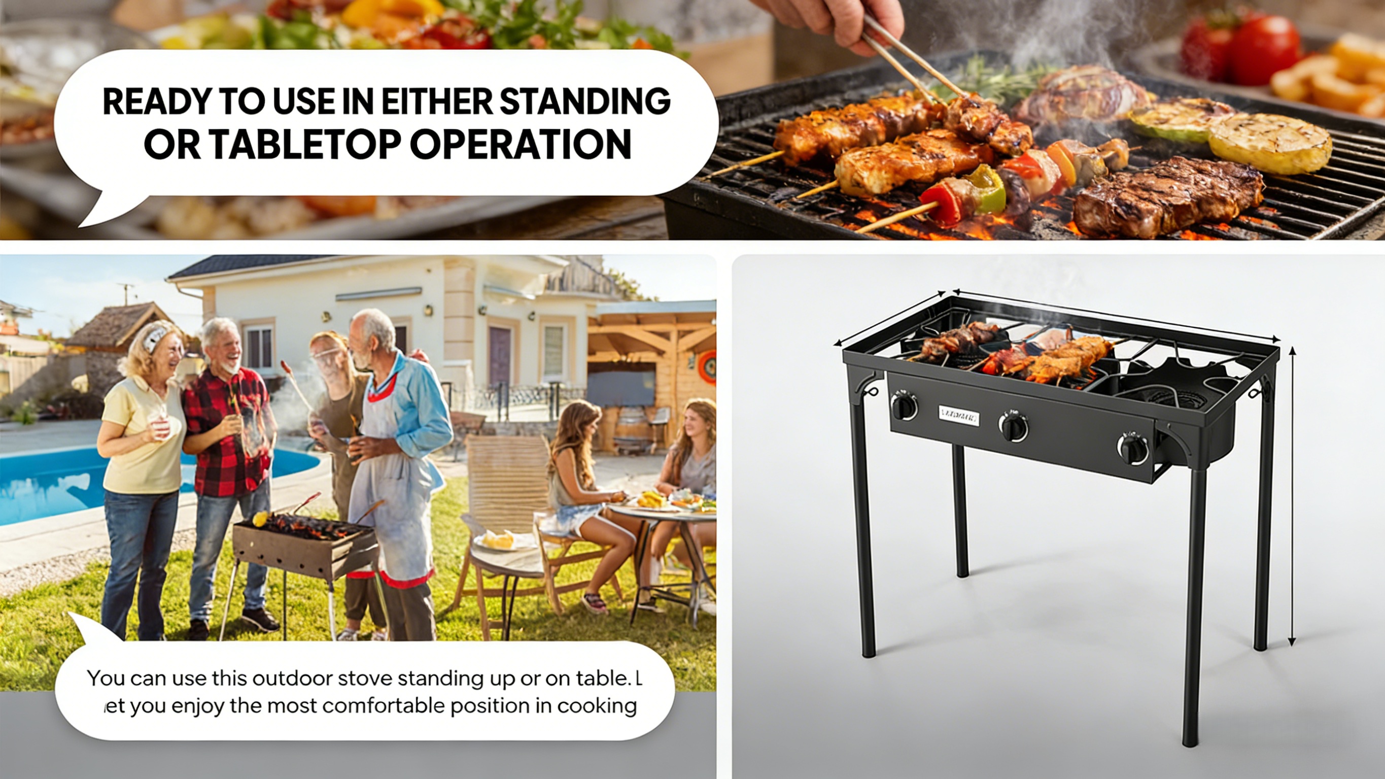 2. Quick Assembly: Put together 4 legs and hook it up with propane gas, then you get an awesome extra cooker. Top working measures 34.3’’ long 17.7’’ wide. Gas tank IS NOT included.