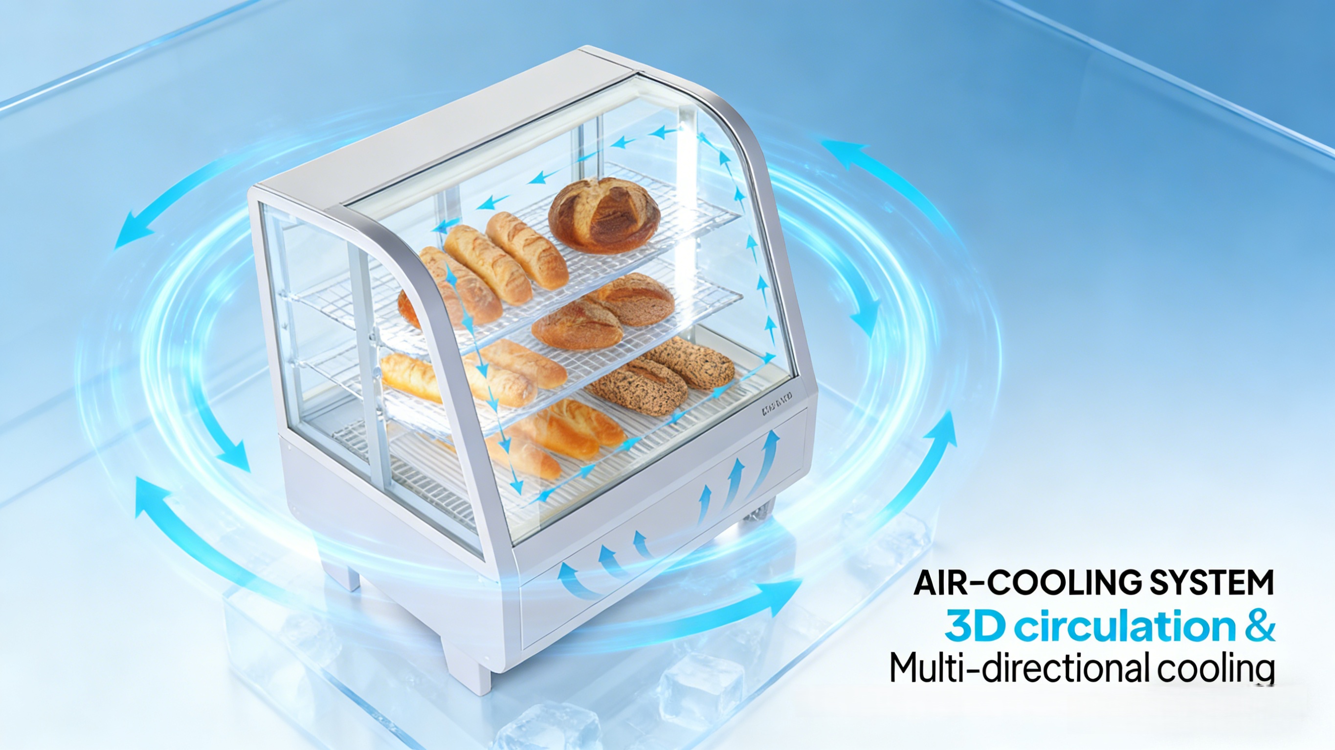 1. Air Cooling & Automatic Defrost: Equipped with a high-performance compressor, this bakery display case delivers rapid cooling while maintaining energy efficiency and quiet operation. Its advanced circulating cold air system ensures uniform temperature distribution for optimal food preservation. The automatic defrost function prevents frost buildup, ensuring clear visibility of your displayed items at all times.