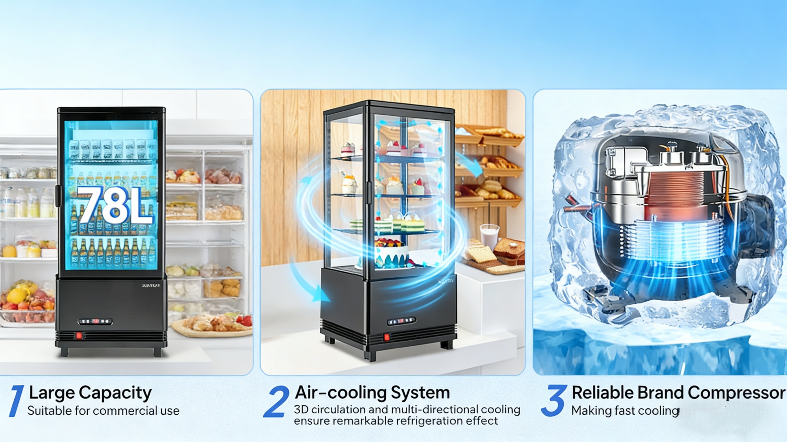 3. Space-Saving Compact Design: With a 3 cu.ft capacity, this slim-profile glass-door refrigerator maximizes your counter space while providing ample room to showcase desserts, pastries, bagels, beverages, yogurt, and fruits. Ideal for cafes, bakeries, convenience stores, and other commercial settings where space is at a premium.